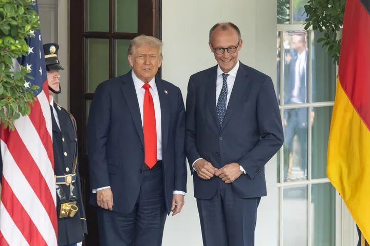 6月5日,美国总统特朗普在华盛顿白宫迎接到访的德国总理默茨。新华社记者胡友松摄